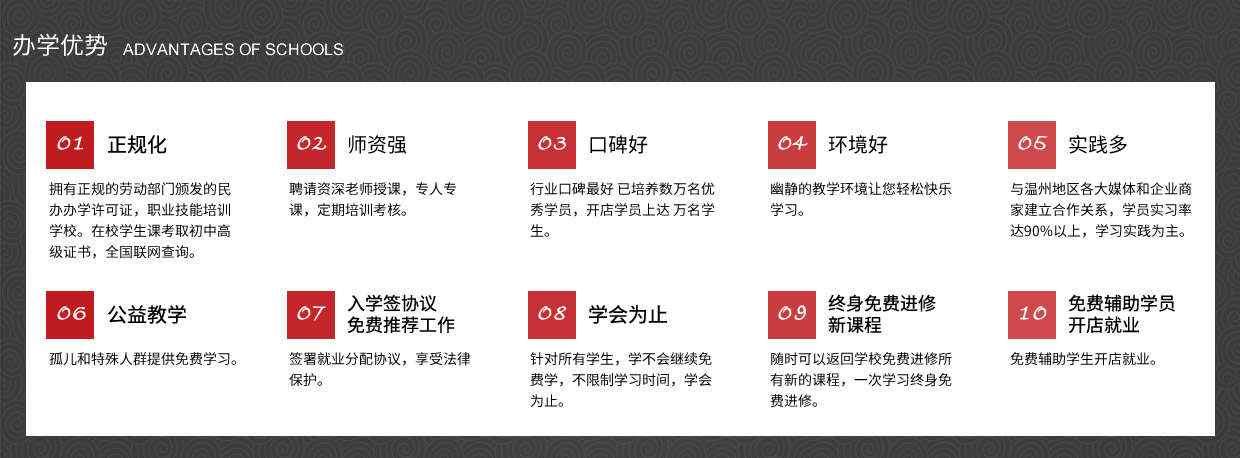 我校以培養(yǎng)實(shí)用型專業(yè)人才為目標(biāo),理論學(xué)習(xí)、操作訓(xùn)練與專業(yè)實(shí)踐三位一體,實(shí)行一對(duì)一的教學(xué)模式,常年招生,男女不限。畢業(yè)后推薦工作、 主要是以理論為輔實(shí)操為主的教學(xué)模式授課。老師手把手教、一對(duì)一輔導(dǎo),為學(xué)員量身定做課程,保證學(xué)會(huì)為止、 中途不收取任何費(fèi)用,(無任何隱形消費(fèi))進(jìn)修新的課程。、簽約教學(xué)、幫助學(xué)員開店就業(yè),免費(fèi)試學(xué)(讓您全方位的體驗(yàn)我們的專業(yè)、讓你不花一分冤枉錢。)